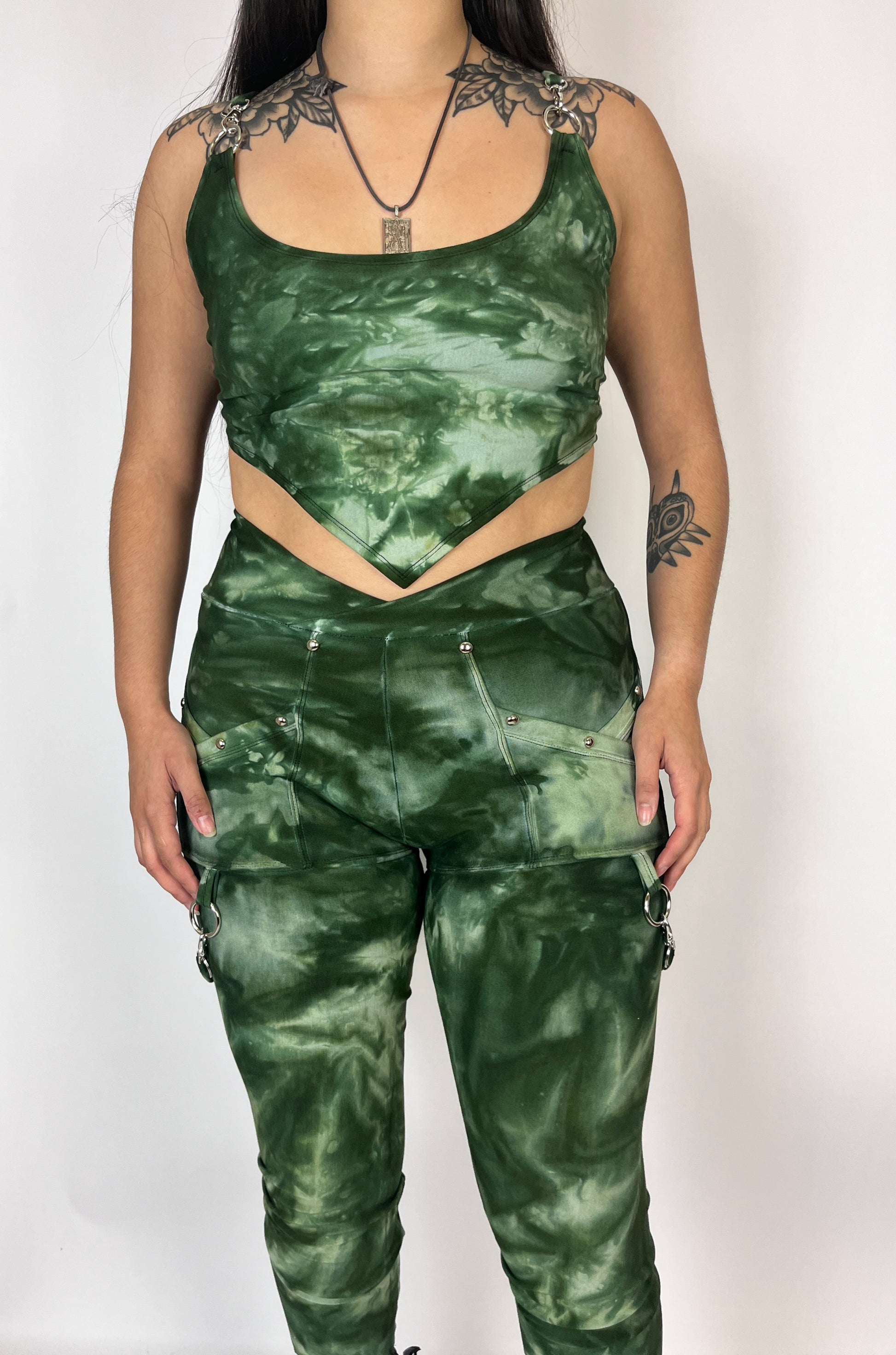 Made from bamboo French terry. Featuring double crossed pockets lined with studs and removable suspenders with a cross waistbandÂ