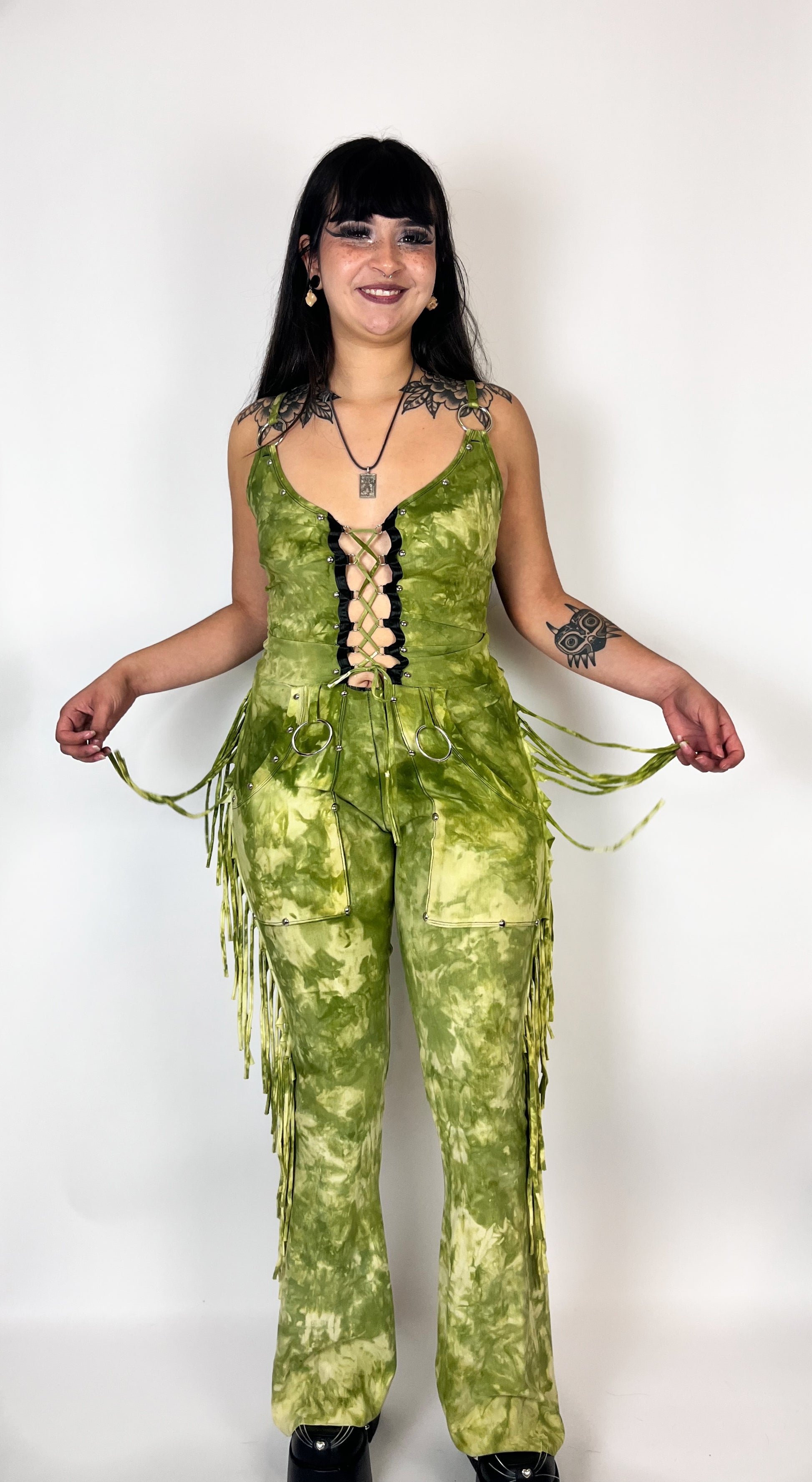 Made from bamboo French terry with a form fitting lace up top and a slight flare fit. Featuring a studded lace up bodice, a bamboo fringe side, o-rings to attach chains to and pockets big enough to hold everything you need for a night out